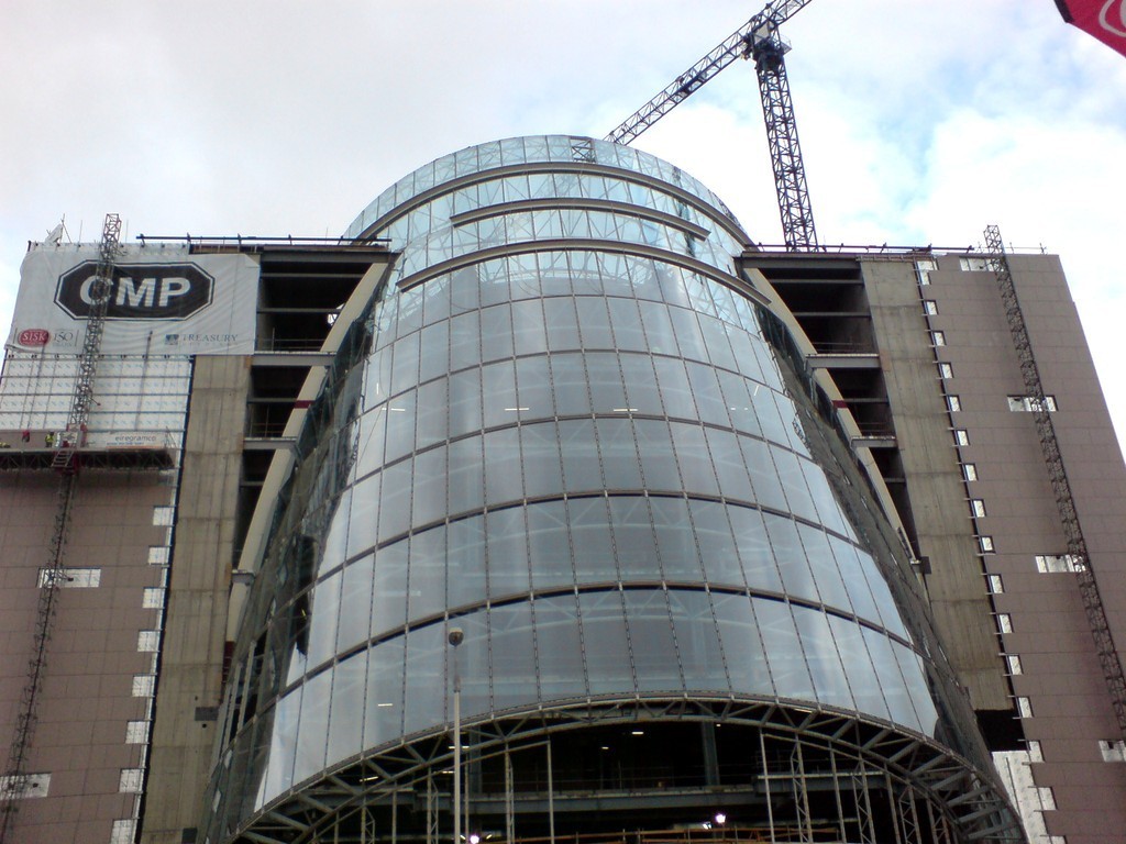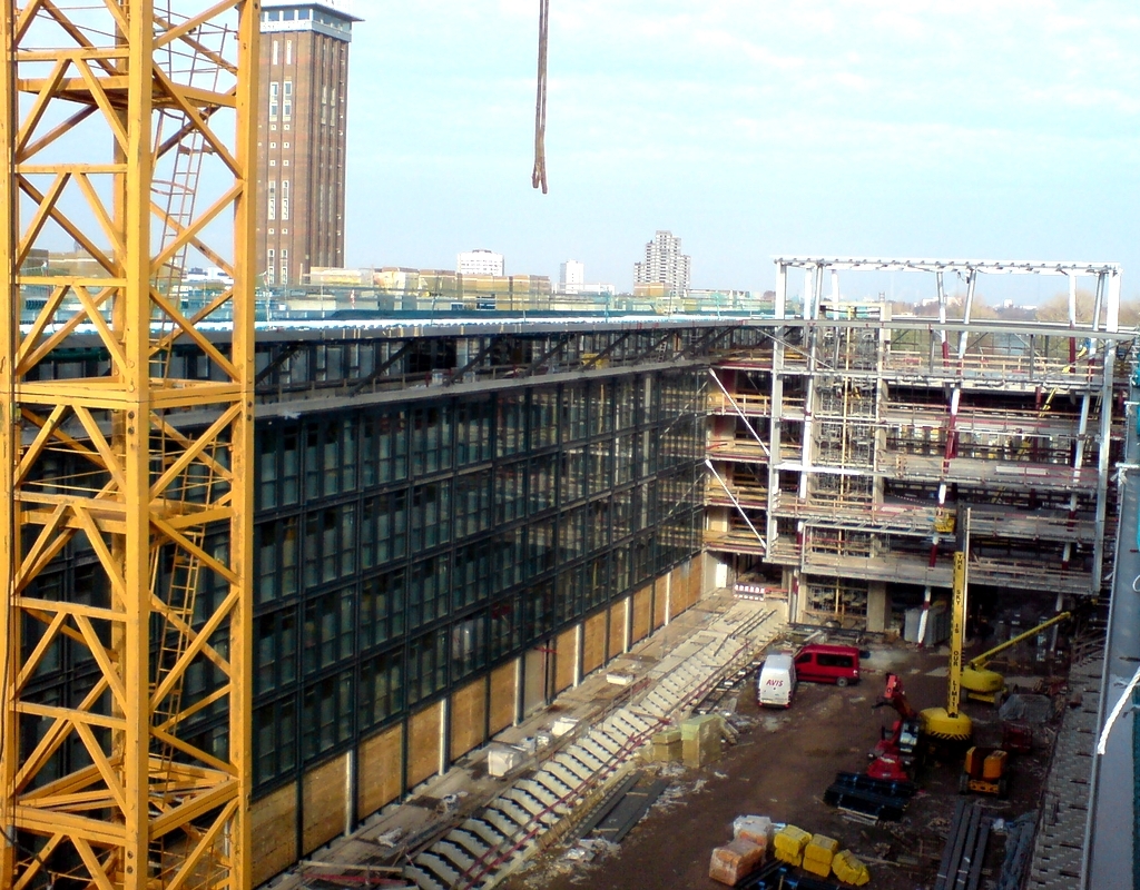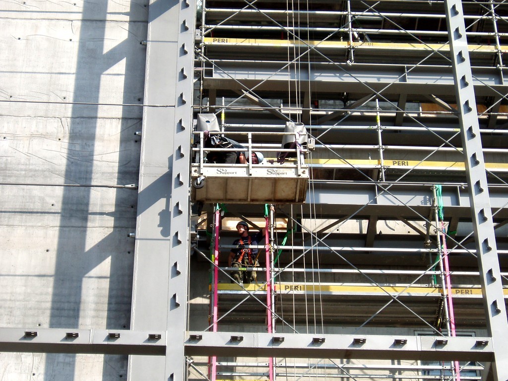 Montage von Glas und Aluminium-Paneels in sich stets verändernden Neigungen und Lagen; Versiegelung der Gebäudehülle