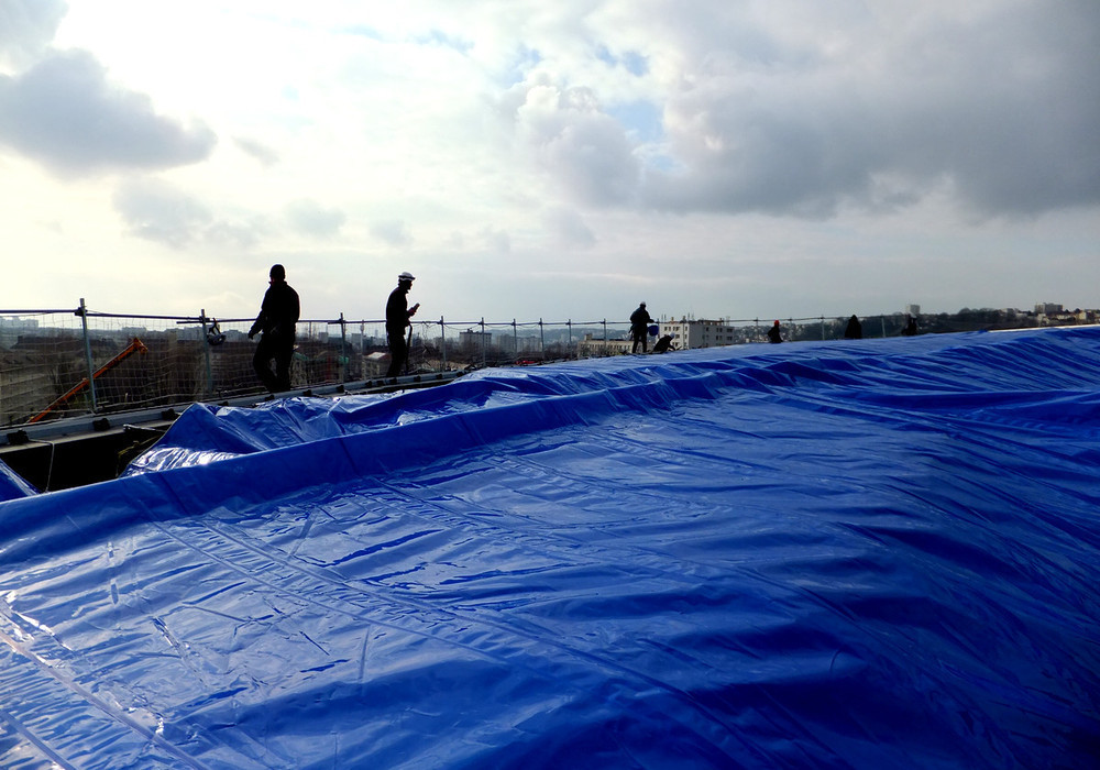 Membran-Installation zur Innenhofüberdachung zwischen zwei Funktionsgebäuden