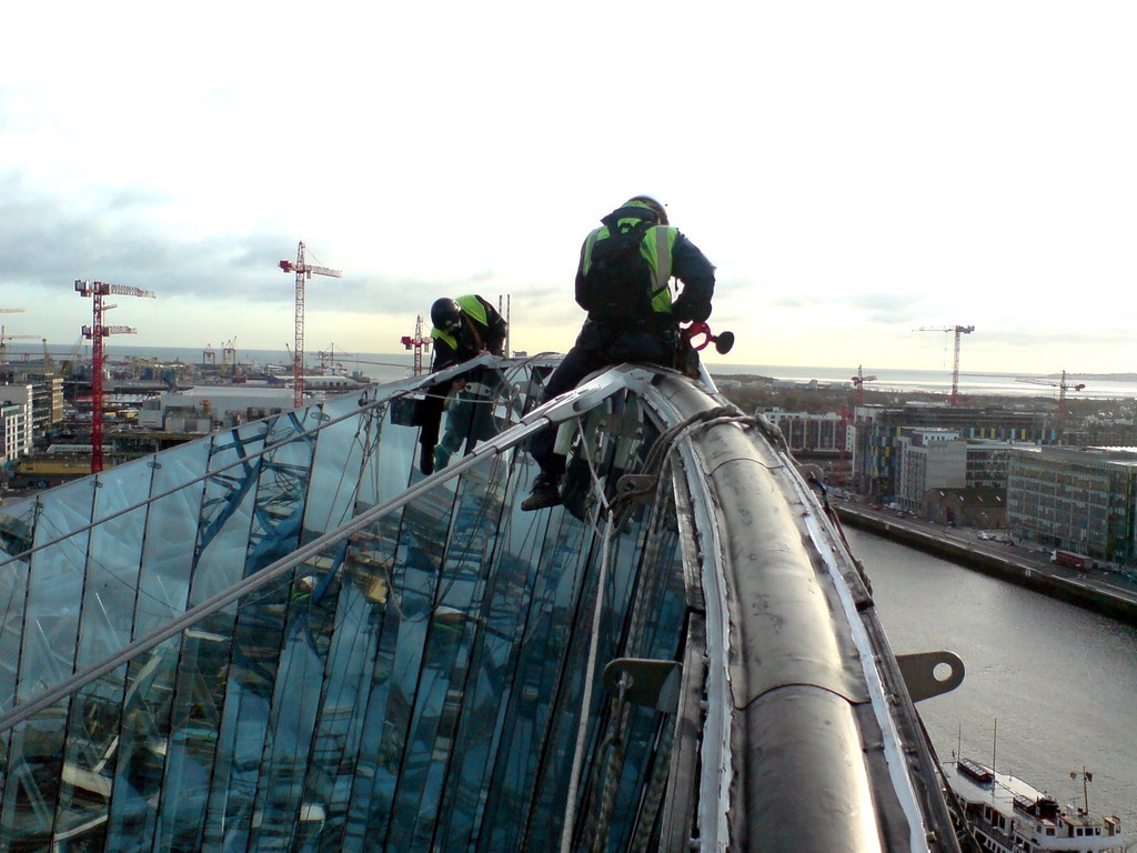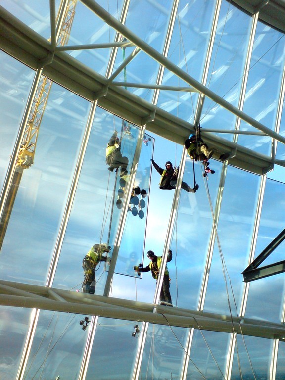 Montage von Glas und Aluminium-Paneels in sich stets verändernden Neigungen und Lagen;aufarbeiten und korrigieren der Versiegelung der Gebäudehülle