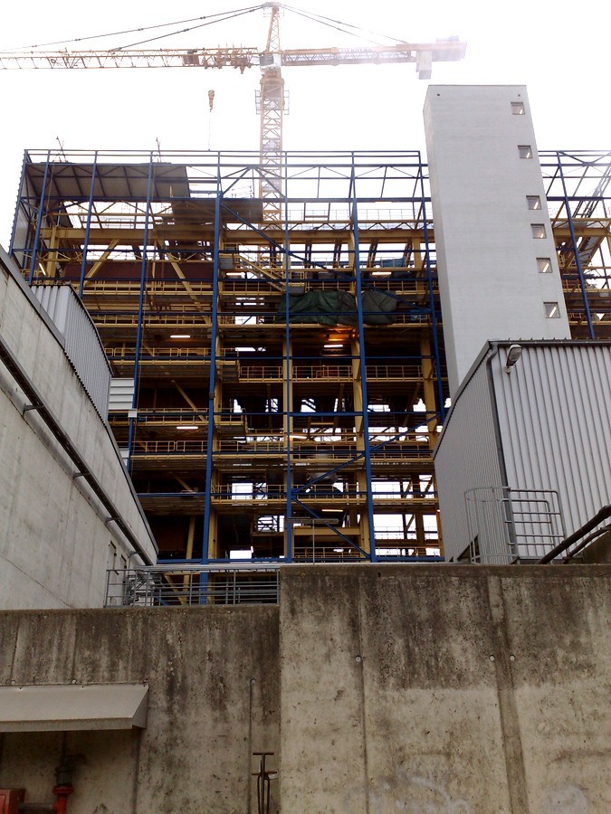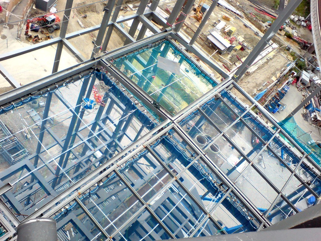 Montage des Sekundärstahls sowie das Aufziehen eines diagonal verspannten Stahlseilgeflechtes, in das die Verglasung anschliessend eingehängt wird. Diese Art der Fassadeninstallation ist europaweit einmalig.