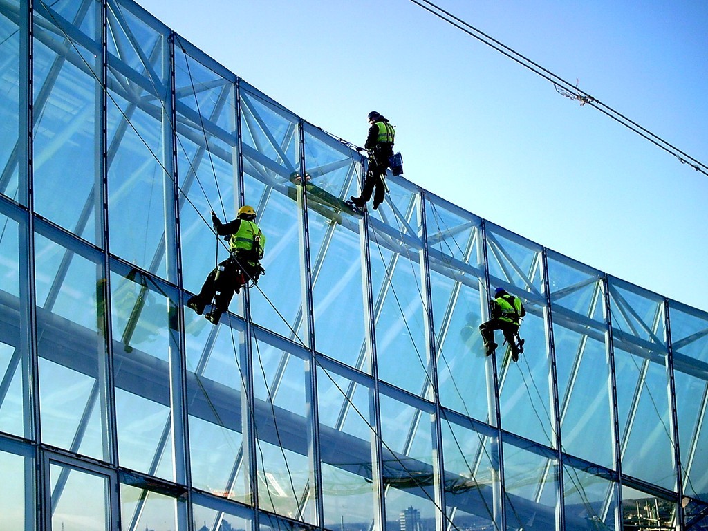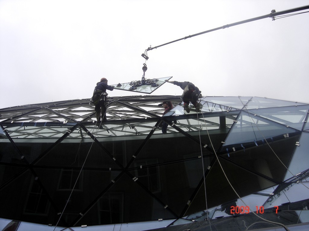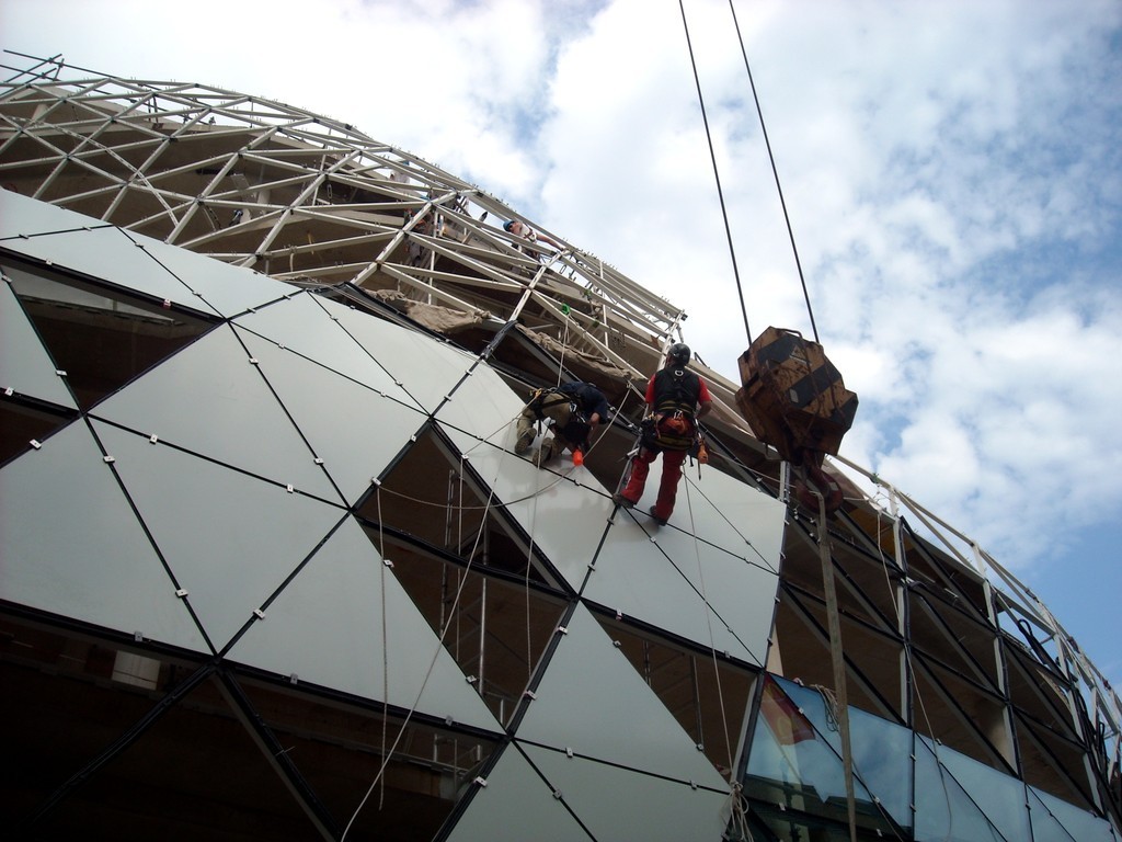 Montage von Glas und Aluminium-Paneels in sich stets verändernden Neigungen und Lagen;aufarbeiten und korrigieren der Versiegelung der Gebäudehülle