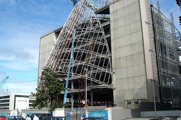 Montage von Glas und Aluminium-Paneels in sich stets verändernden Neigungen und Lagen; Versiegelung der Gebäudehülle